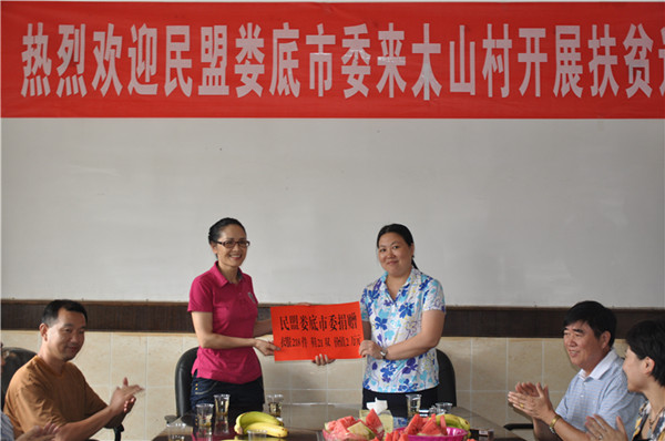 邵瑛代表民盟婁底市委(左)向木山村捐贈物品