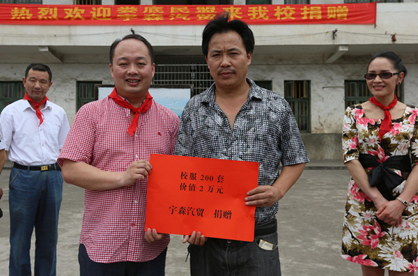 潘杰(左)代表婁底宇森汽貿集團向惠民學校留守兒童贈送校服