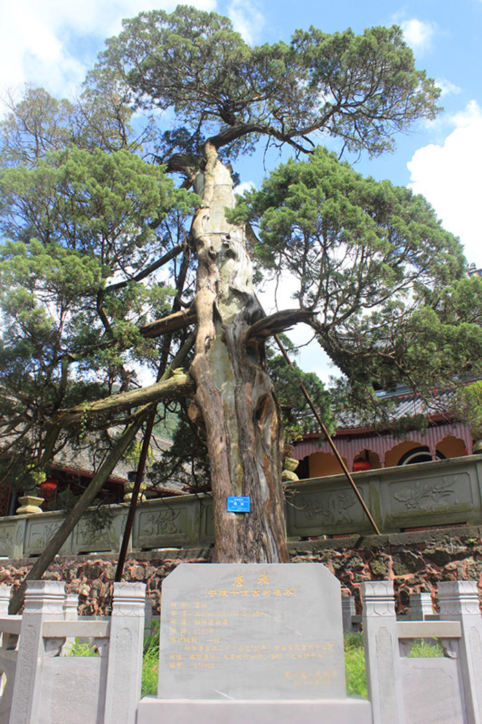 禪宗佛殿到處都大同小異,無甚可記。倒是佛殿前有一棵唐代柏樹,經(jīng)歷千百年風(fēng)雨侵蝕,仍然屹立不倒,只是脖子向北歪斜,不得不另建支架撐住保護(hù)。這棵寧死不屈的歪脖子松柏,也算是樹木中富有個性的“倔老頭”吧。都說江浙人脾氣如吳儂軟語,軟綿綿的。這位長在浙江的“倔老頭”,怎么倒有些湖南人的倔強(qiáng)霸蠻脾氣呢??看來,他與那位曾在浙江當(dāng)過巡撫(略當(dāng)于浙江省委書記省長人大主任政協(xié)主席及公檢法司首腦)湖南“犟驢子”左宗棠,有得一比拚了。