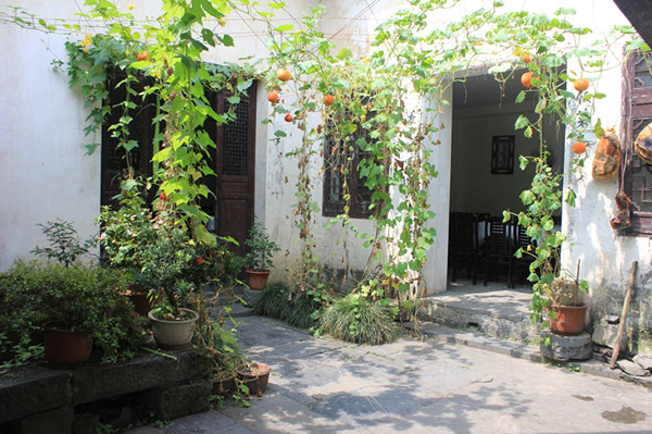 中午在宏村某民居家用餐,門(mén)外溪水鳴啾啾,流向九曲十八灣;門(mén)內(nèi)庭院深幾許,鮮花瓜果滿枝頭。想想陶淵明的桃花源里人家的生活,也不過(guò)如此!