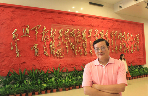 大廳背面墻上有一個巨大的長方體,鐫刻著毛澤東19655月所寫《水調歌頭·重上井岡山》一詞。仍是毛體書法,紅底黃字。毛氏書法飄逸絕倫,恰如其詩人的浪漫情懷,不拘小格。