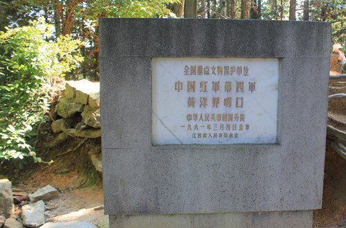 從黃洋界游客服務中心觀景點左走,再折向北面是臺階,兩邊均是筆直的杉木,有碗口大的,有手臂粗的,當然也有直徑相當大的。走了100余級臺階,即到了當年黃洋界保衛戰的哨口與工事。有關部門在此立了一塊石碑,稱是全國重點文物保護單位,上書“中國紅軍第四軍黃洋界哨口”,既是對歷史古跡的提示,也是讓游人有立此存照的機會。同仁們紛紛在此留影,有是有到此一游的證據。
