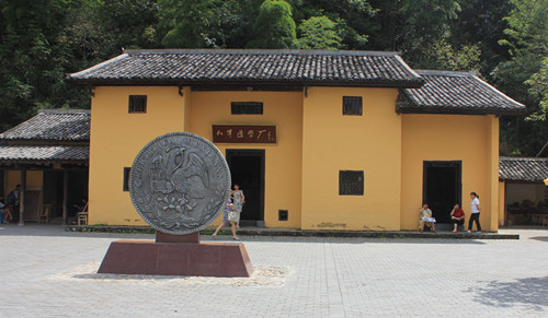 紅軍造幣廠位于茨坪西北面的上井村。這是一座普通的民宅,灰色尖瓦頂,一色的黃墻壁,傳統(tǒng)三進(jìn)的客家式建筑,是一所土坯房。紅軍造幣廠是1998年按原樣重建的,在古樸陳舊的大門上方,有蕭克將軍題寫的“紅軍造幣廠”紅匾。正門的地坪上,豎放著一個巨型的墨西哥鷹字銀元,算是造幣廠的一個標(biāo)志吧!紅軍造幣廠的技術(shù)總監(jiān)謝火龍兄弟,是假幣制造者,當(dāng)年謝氏兄弟制造的假幣幾可亂真。