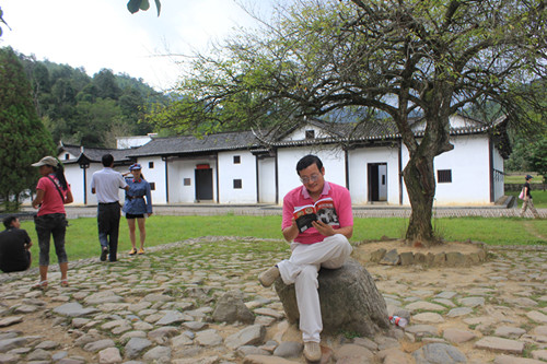 我拿著從黃洋界購買的《井岡山雙雄》一書,在“讀書石”上POSE一番,算是有了到此一游的證據(jù)。照相雖是擺拍,但我與毛澤東卻有同好,讀書一直是我最大的嗜好,并非裝模作樣。因此,在偉人留下印記的“讀書石”上棒讀留影,還真沒辜負(fù)偉人和石頭的共同期望。
