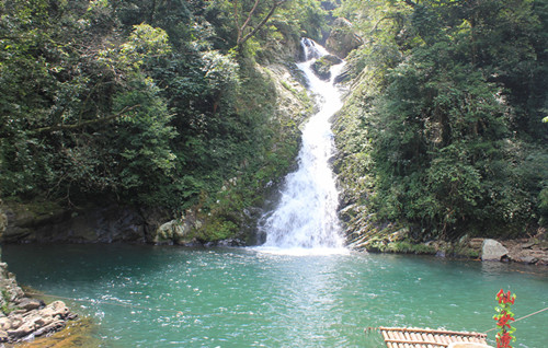 沿著溪水往下走,穿過小一線天,進(jìn)入一片杜鵑林,便可看到第二個瀑布——鎖龍瀑,亦稱黑龍瀑。據(jù)說此瀑落差30多米。