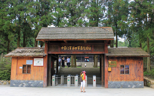 紅軍醫(yī)院依山而建,占地面積約100畝,地勢平坦,地形方正。臨公路旁是一座木質(zhì)結(jié)構(gòu)的牌樓,牌樓屋頂均為樹皮或茅草做蓋瓦;正中央有金碧輝煌的“中國紅軍第四軍醫(yī)院舊址”字樣,疑為老紅軍兼書法家舒同手跡;招牌正下方即為電子檢票進(jìn)出口;左右各有一座低矮的小木屋,為工作人員值班員;紅軍醫(yī)院四周用竹籬笆圍住。門樓后面有一排參天而立的杉樹,約20棵。
