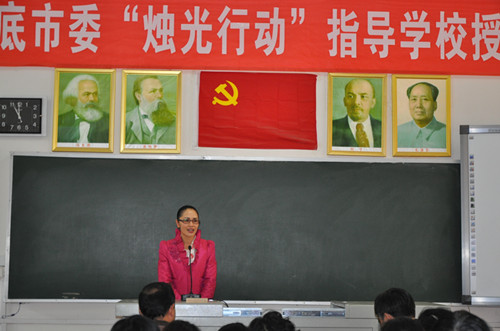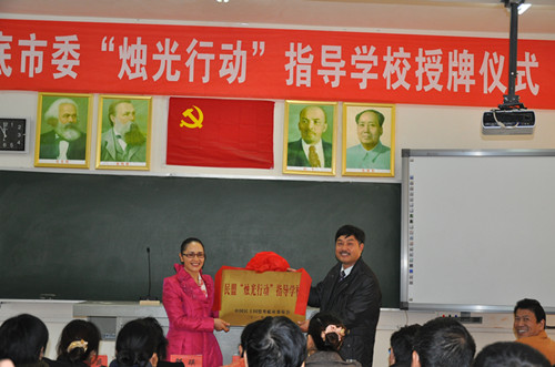 授牌儀式上,邵瑛作了重要講話。她代表民盟市委感謝婁底一中對婁底民盟“燭光行動”的支持。近2年多來,婁底一中十分支持婁底民盟“燭光行動”,向民盟市委“燭光行動”定點扶持的漣源斗笠山鎮(zhèn)惠民學(xué)校捐贈課桌椅260多套,改善了惠民學(xué)校的教學(xué)條件。并通過各種方式免費為惠民學(xué)校培訓(xùn)教師,促進(jìn)了惠民學(xué)校教育教學(xué)水平的提高。