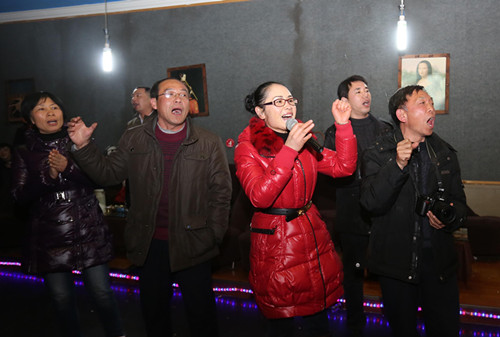 邵瑛主委在新春聯歡會上和盟員們高唱《團結就是力量》。