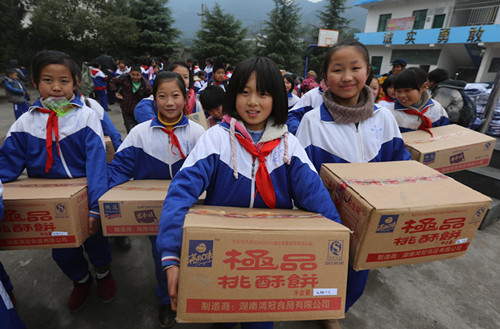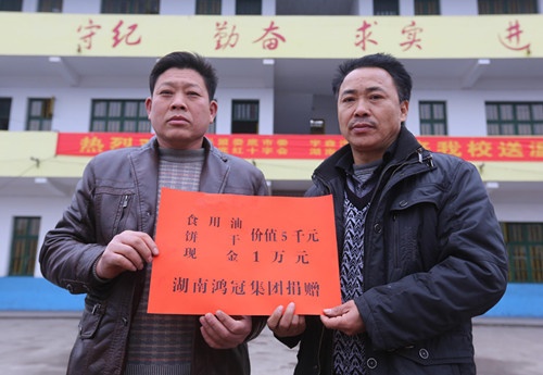 湖南鴻冠集團贈送1萬元現金,價值5千元的餅干、食用油給惠民學校。