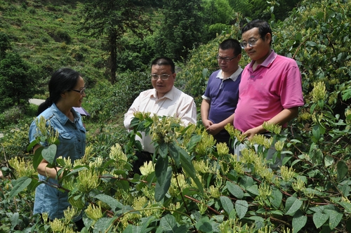 張治求(左2)邵瑛(左1)一行介紹隆回縣小沙江金銀花今年產(chǎn)量高質(zhì)量好但價格低。彭育峰攝影。