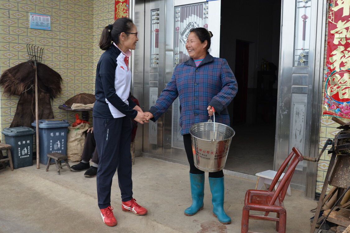 邵瑛(左)給結(jié)對幫扶貧困戶送水桶