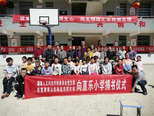 上午,黨支部和民盟支部在新化縣水車鎮直樂村直樂小學聯合舉辦了以“大力推廣普通話,助力脫貧攻堅戰”為主題的志愿活動。兩個支部向學校捐贈了總價值達八千余元的各類圖書432冊。本次捐獻的書籍大部分是適合孩子們閱讀的經典國學、詩文、童話故事以及其它有益于孩子們身心健康的課外書籍,目的就是助力開拓貧困村孩子們的閱讀視野和思維,在書中探尋世界,在書中增長見識;豐富孩子們的課外生活,讓孩子們愛上學習,愛上閱讀,享受閱讀,在閱讀中學習普通話。捐書活動現場,民盟盟員、中國作家協會會員、中國寫作學會雜文專業委員會常務委員、湖南省作家協會教師分會副主席、《讀者》《特別關注》《格言》《幽默與笑話》等刊簽約作家,婁底市作協副主席,文學院副教授游宇明現場簽名捐贈了自己的文學作品。民盟湖南人文科技學支部主委、教務處副處長謝四連教授向孩子們講述了說好普通話、讀好書的重要性,并承諾湖南人文科技學院教務處黨支部和民盟湖南人文科技學院支部以后每年向直樂小學捐贈一批圖書,把圖書借閱室管好建好。