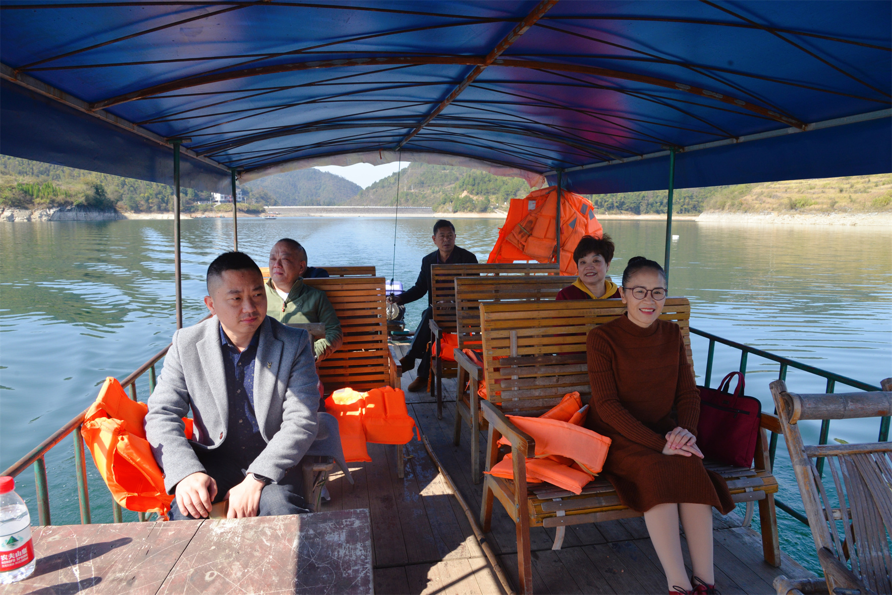 座談會后,調(diào)研組一行在饒保衛(wèi)等陪同下,乘船考察了車田江水庫,并到即將建成完工的車田江特大橋?qū)嵉乜疾臁p埍Pl(wèi)介紹,車田江水庫位于新化縣油溪河上游,車田江水庫大壩是一座以灌溉為主,結(jié)合發(fā)電、防洪等綜合效益的大Ⅱ型水利工程,水源主要灌溉新化縣溫塘鎮(zhèn)、田坪鎮(zhèn)、坐石鄉(xiāng)、吉慶鎮(zhèn)等多個鄉(xiāng)鎮(zhèn)。為了保護好水庫的生態(tài)環(huán)境,水庫及周邊的游樂場、網(wǎng)箱養(yǎng)魚、養(yǎng)豬場、煤礦、砂石廠都關(guān)閉了。看到湖水清澈翠綠,群峰環(huán)抱,白鷺共舞,調(diào)研組一行紛紛稱贊車田江水庫風光優(yōu)美,環(huán)境保護和綜合治理工作卓有成效。