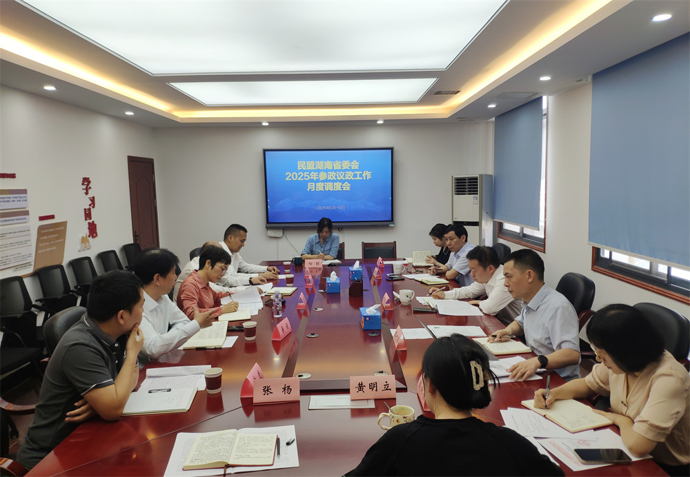 5月16日,民盟湖南省委會召開2025年參政議政工作月度調度會,省政協副主席、民盟省委會主委何寄華出席并講話,民盟省委會專職副主委王文強、秘書長任師海參加會議。