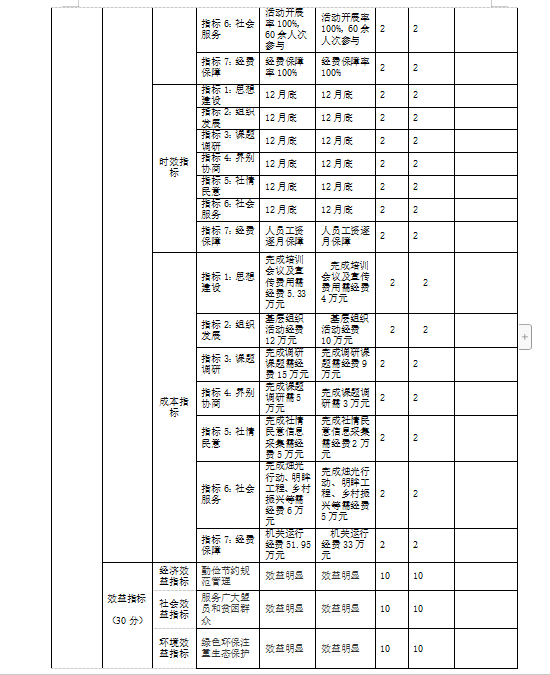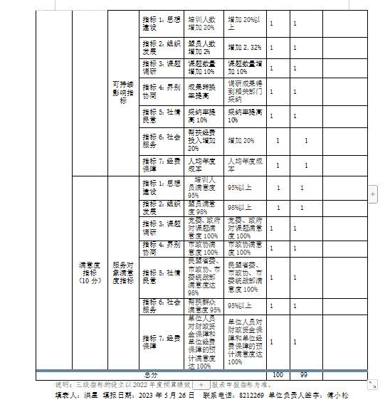 自評(píng)得分情況:根據(jù)年初的績(jī)效考核工作計(jì)劃和目標(biāo),較好地完成了全年的目標(biāo)工作任務(wù)。自評(píng)為99分。詳見(jiàn)部門整體支出績(jī)效評(píng)價(jià)指標(biāo)表。