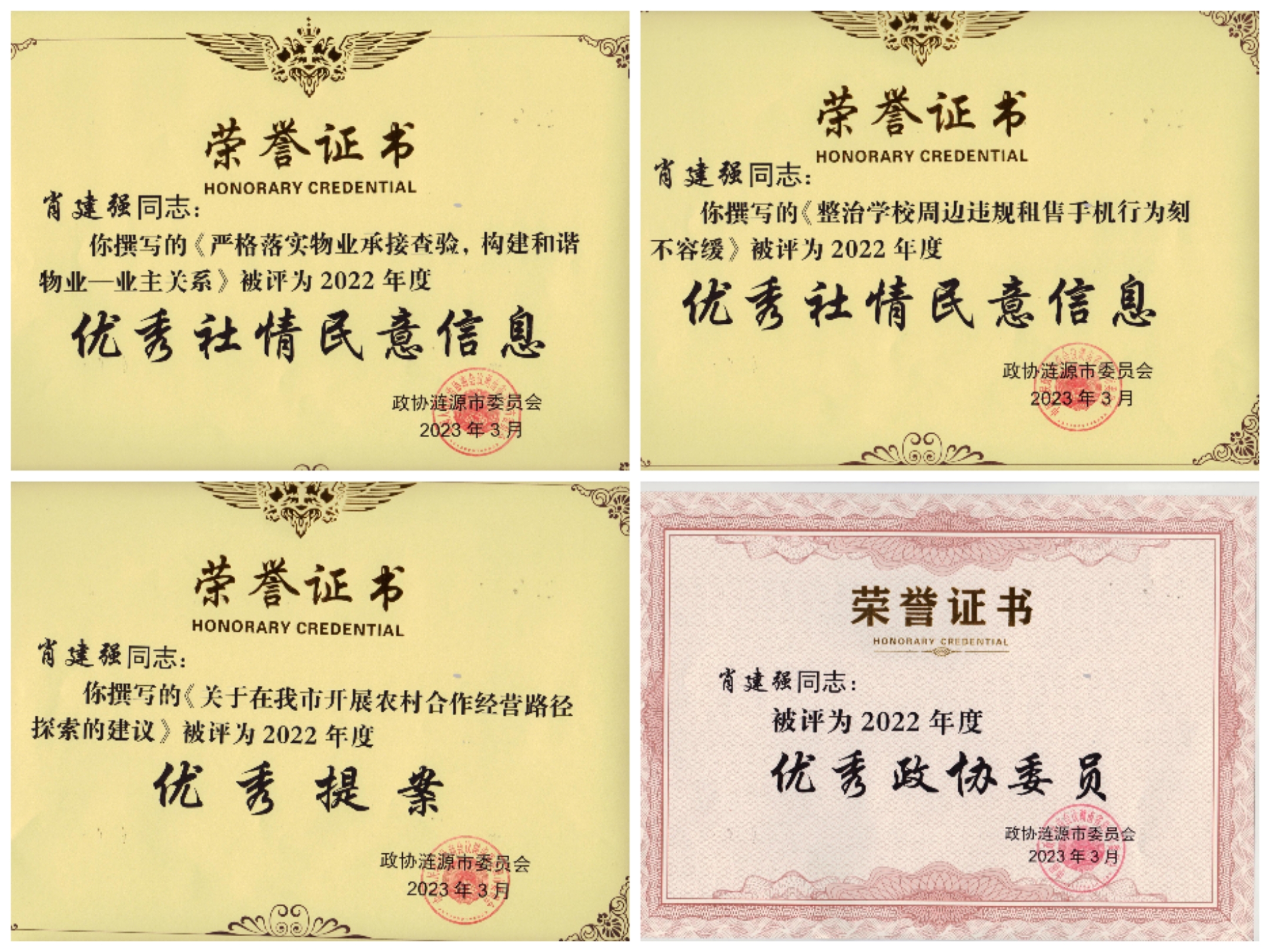 會議期間,盟員委員積極發揮界別特色,以飽滿的熱情和高度的政治責任感,積極參與聯組座談討論,踴躍建言獻策,充分展現了民盟委員們心系大局、情系民生的良好形象,共提交提案8件。肖建強等一批優秀委員憑借2022年度的積極作為、出色表現,多次被大會提及和表彰。在優秀提案、調研報告、社情民意信息、大會發言等方面均有突出表現,發出了民盟好聲音,展現了民盟好作為。民盟界別政協委員活動組榮獲“先進集體”稱號,撰寫的《提升政協履職運用效能路徑探析》榮獲“2022年度優秀理論文章”,撰寫的《加強物業管理的調研報告》榮獲“2022年度優秀調研報告”。民盟漣源市委會專職副主委肖建強被評為“2022年度優秀政協委員”,撰寫的《關于在我市開展農村合作經營路徑探索的建議》被評為“2022年度優秀提案”,撰寫的《嚴格落實物業承接查驗,構建和諧物業—業主關系》《整治學校周邊違規租售手機行為刻不容緩》被評為“2022年度優秀社情民意信息”。漣源市政協四級調研員、民盟漣源市委會副主委曾芝紅撰寫的《關于建設智慧停車系統,解決城區停車難的建議》被評為“2022年度優秀提案”。曾芝紅、劉慧雄、廖春南、廖澤林、潘萌、匡合群、吳秋平等七名盟員榮獲“2022年度政協云運用先進個人”。