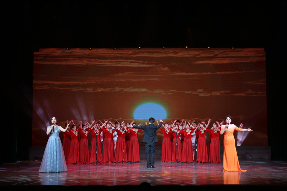 盟員吳健(中)指揮、易毅(左)、鐘艷(右)領唱、民盟婁底技師學院支部表演的大合唱《我的祖國》