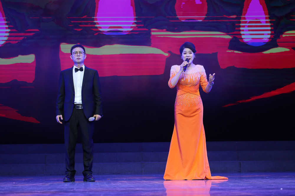盟員鈡艷(右)和周杰,演唱盟員楊建農作品《大愛無疆》