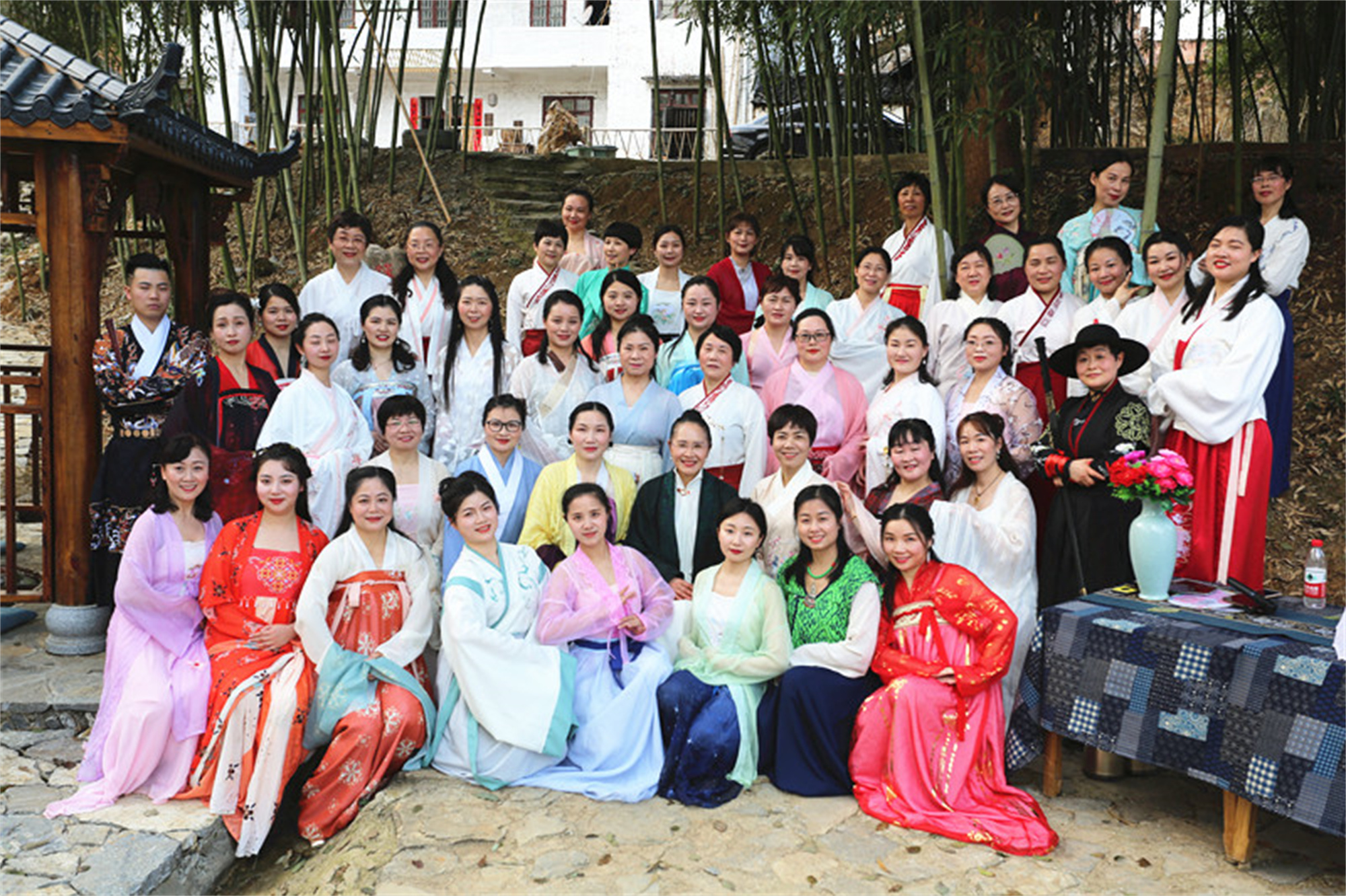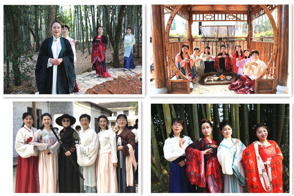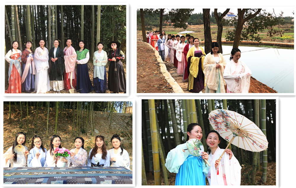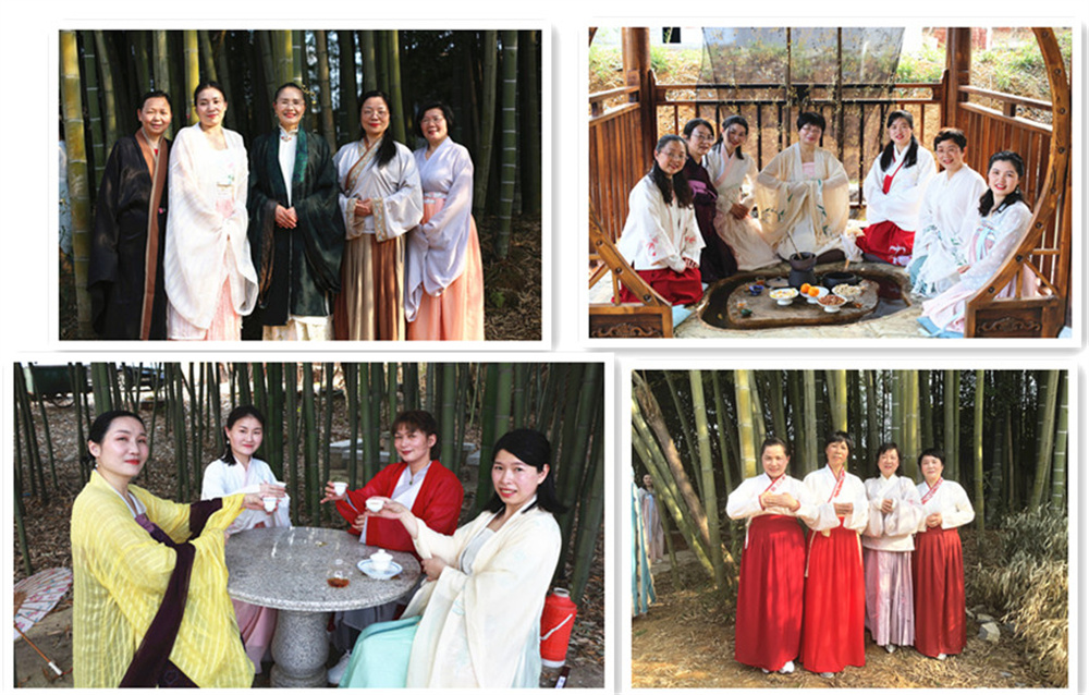 女盟員身著精美華服、邁著優(yōu)雅的腳步,行走在鄉(xiāng)間小道、留連在翠綠竹林,賞春日景色,品曲水流觴,一顰一笑回蕩在山林間,仿佛穿越時空,回到那遙遠(yuǎn)的時代。