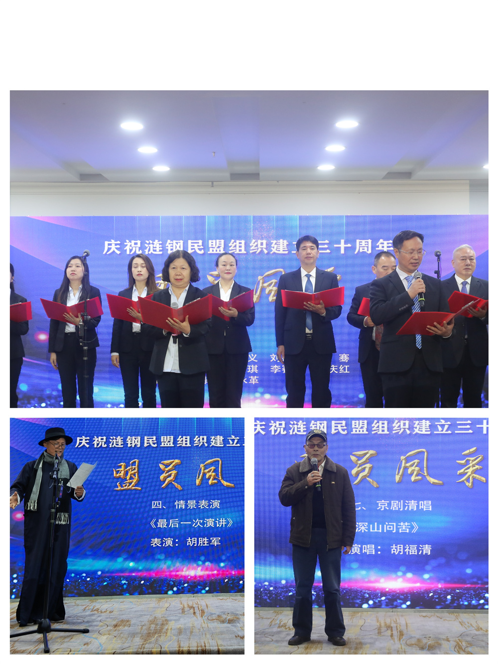 隨后,來自民盟漣鋼支部、漣鋼中學支部、婁底市第一人民醫院支部的盟員們自導自演了一臺精彩的文藝演出,先后表演了《幸福中國一起走》(女聲獨唱)、《興醫強國》(三句半)、《飄落》(男聲合唱)、《最后一次演講》(情景表演)、《深山問苦》(京劇清唱)、《民盟之歌》(集體朗誦)等文藝節目,表達愛國愛黨愛盟之心。