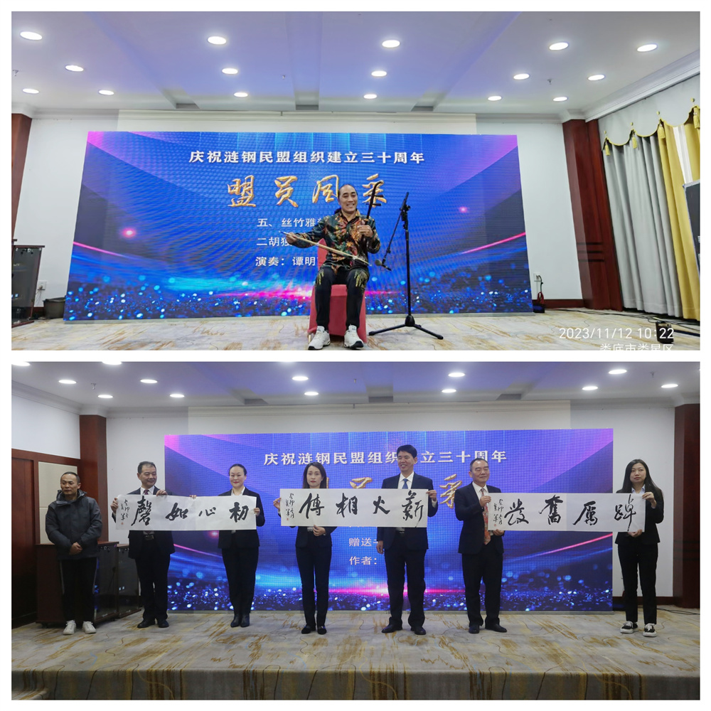 期間,湖南省二胡協會副會長、二胡演奏家、婁底市綜合三支部盟員譚明哲現場演奏二胡曲目《梨花頌》、《掛紅燈》,婁底民盟書畫院院長劉翼軍分別向漣鋼區域3個民盟組織贈送其創作的3幅題為“薪火相傳”、“初心如磐”、“踔厲奮發”的書法作品,以示祝賀。