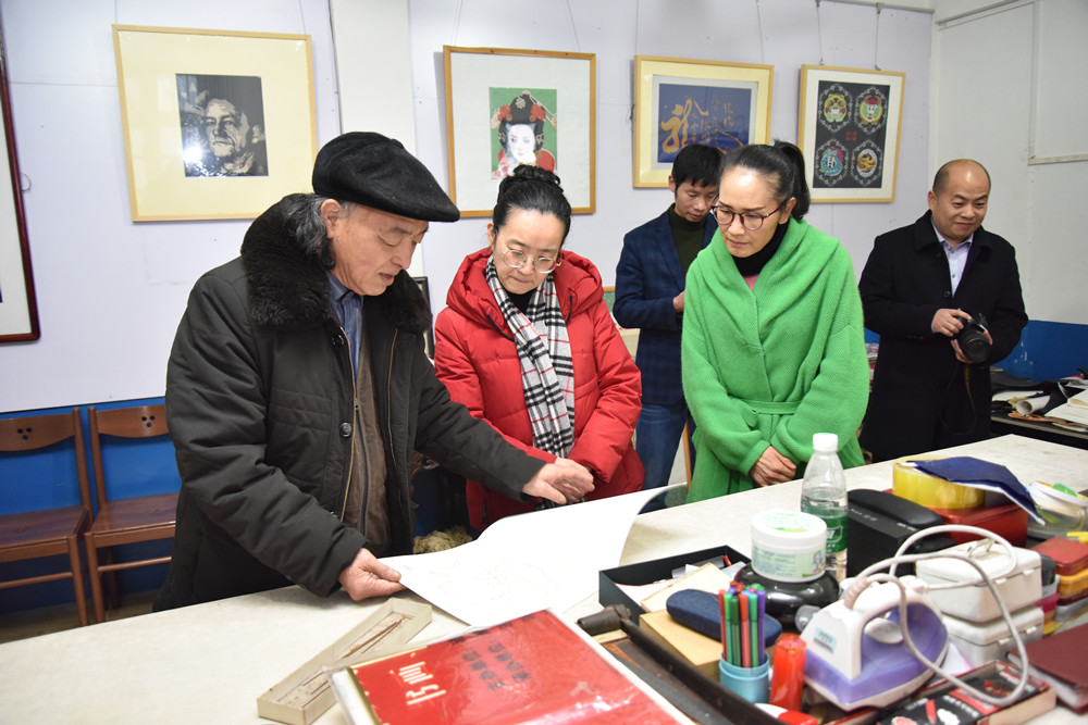 在盟員姜新民工作室,胡穎一行參觀了老藝術(shù)家姜新民的藝術(shù)作品,對姜新民老盟員數(shù)十年如一日,孜孜以求,熱愛藝術(shù)表示敬佩,對其精湛絕倫的火烙畫藝術(shù)表示驚嘆,并祝福姜老身體健康、藝術(shù)長青。胡穎還接見了漣源文化館盟員藝術(shù)家姚垚、姜藝等,表揚她們?yōu)榭箵粜鹿诜窝滓咔閯?chuàng)作文藝作品。