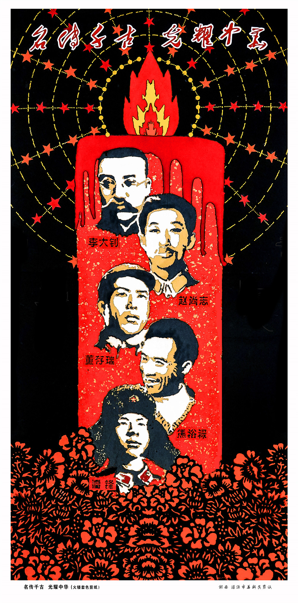 作品簡介:五幅火鏤剪紙作品以偉人、東方紅、革命先烈、 普通百姓等形象為題材,在中國共產黨百歲華誕之際,通過緬懷先烈、先進,讓人們銘記中國共產黨為了建立新中國,拋頭顱、灑熱血的歷史,表達了作者祝福祖國、贊美英雄、謳歌時代的感情。
