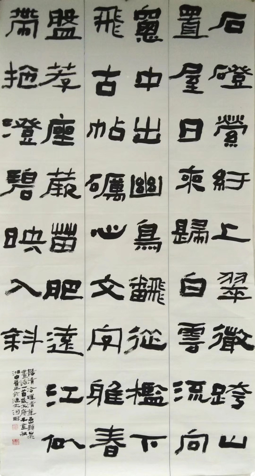 作品簡介:金文書毛澤東《七律·人民解放軍占領南京》中"虎踞龍盤今勝昔,天翻地覆慨而慷"詩句,筆意雄奇,以求渾樸高古、峻秀勁健、奇逸飛動、天然率真之氣息,表達詩人面對南京天翻地覆、今勝往昔的變化,心潮澎湃、慷慨激昂的革命豪情。