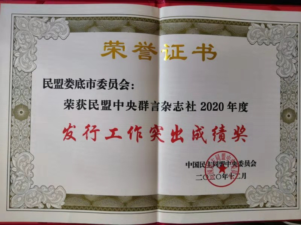 為肯定成績、表彰先進、凝聚力量,近日,民盟中央對在2020年度《群言》發行工作中表現突出的省級組織和市級組織進行表彰。民盟婁底市委會榮獲發行工作突出成績獎。