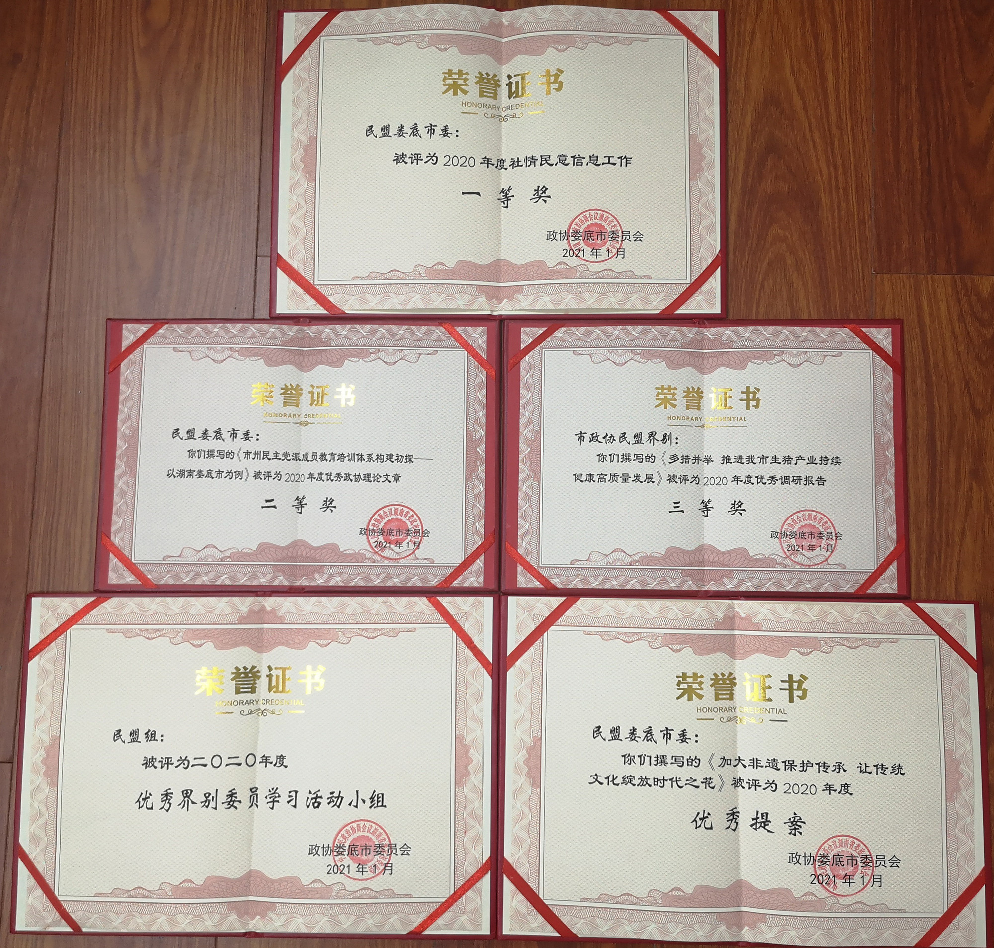 會上,民盟婁底市委會和多位盟員獲得表彰獎勵。民盟婁底市委會榮獲“婁底市政協2020年度社情民意信息工作先進單位一等獎”,民盟組榮獲“婁底市政協2020年度優秀界別委員學習活動小組”,民盟婁底市委會《市州民主黨派成員教育培訓體系構建初探——以湖南婁底市為例》榮獲“婁底市政協2020年度優秀政協理論文章二等獎”,《多措并舉 推進我市生豬產業持續健康高質量發展》榮獲“婁底市政協2020年度優秀調研報告三等獎”,《加大非遺保護傳承,讓傳統文化綻放時代之花》榮獲“婁底市政協2020年度優秀集體提案”。王文成、劉偉鋒、劉兆梅、劉姣艷、羊小慶、肖正懷等6人榮獲“婁底市政協2020年度優秀政協委員”,王紅貴、陽偉書、李海日榮獲“全市政協2020年扶貧行動先進個人”,吳志奇榮獲“婁底市政協2020年度優秀政協新聞宣傳工作者一等獎”,肖正懷榮獲“婁底市政協2020年度政協云應用工作先進個人一等獎”、李海日榮獲三等獎。朱宏志《落實公交優先戰略,加快推進“公交都市”建設》,劉偉鋒《充分利用婁底文化資源優勢,大力推動異地文化產業合作》,陽偉書《關于把珠山公園打造成“賢母文化”主題文化公園的建議》,羊小慶《加快市級融媒體建設的建議》等4份提案榮獲“婁底市政協2020年度優秀提案。朱宏志《聚力建設三一婁底產業園,打造婁底制造強市一號工程》《對打造千億先進陶瓷產業集群的建議》,王紅貴《發揮婁底教育資源優勢打造教育強市》,凌會海《加強教育集團化辦學與信息化建設,促進我市中小學教育均衡優質發展》,劉姣艷《切實提升突發公共衛生事件醫療救治能力》等5篇建議,榮獲婁底市政協“我為‘十四五’規劃獻一策”活動優秀建議。