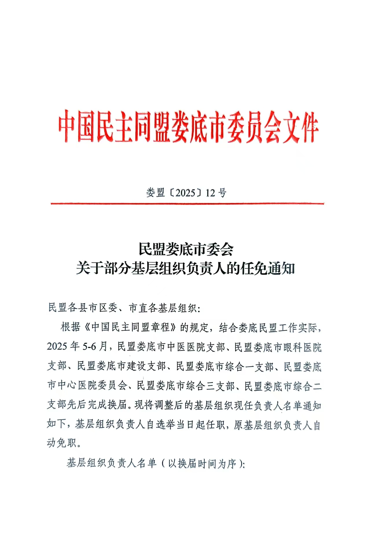 民盟婁底市委會關(guān)于部分基層組織負(fù)責(zé)人的任免通知