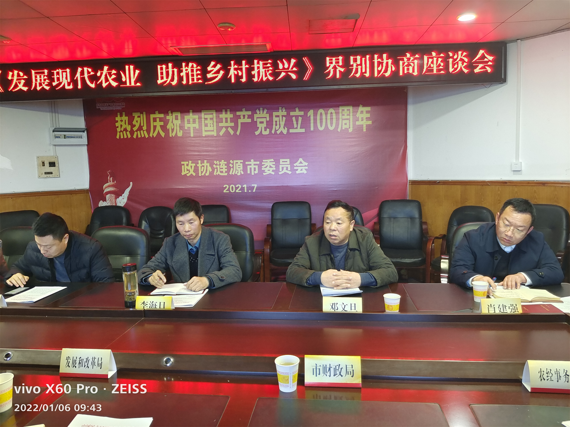 2022年1月6日,“發展現代農業 助推鄉村振興”界別協商座談會在漣源市政協會議室召開。二級調研員鄧文旦出席會議,漣源市政協副主席李海日出席并主持。漣源市農業農村局、鄉村振興局、市發改局、財政局、畜牧水產中心、農機事務中心、農經事務中心、商務糧食局、民盟界別調研組成員參加會議。